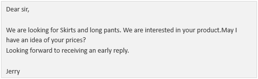 当然还有另外一种情况,就是对方是真的采购商,通过这样的邮件去询问不同的供应商,进行一个比价,但是这么简单的询问说明对方并不急着采购,所以对于这样的询盘可以先不管。